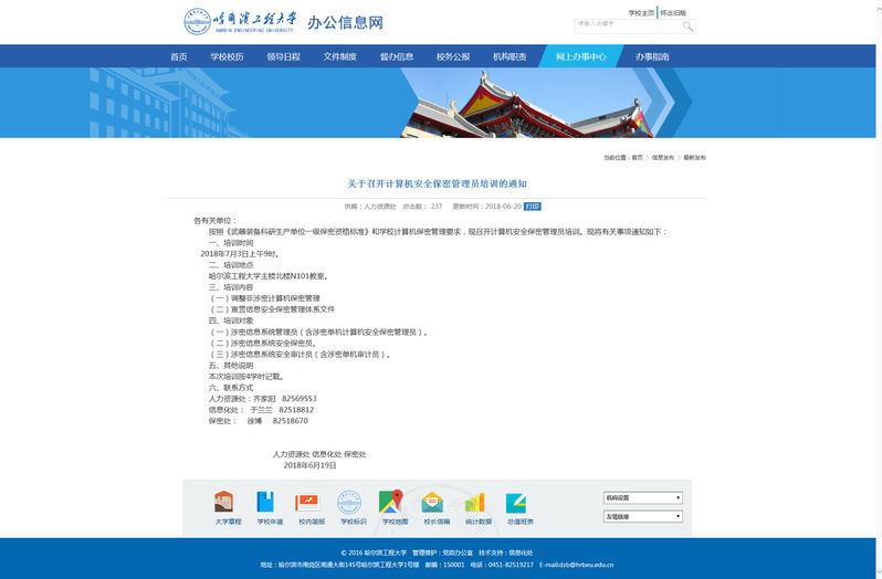 学校将于2018年7月3日上午9时在主楼北楼N101教室召开计算机安全保密管理员培训,现将通知转发如下,请相关保密管理员务必准时参加,会后组织本课题组涉密人员及时学习并做好签到登记,本次培训按4学时记载。