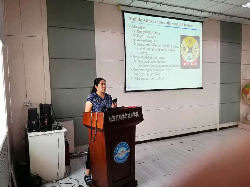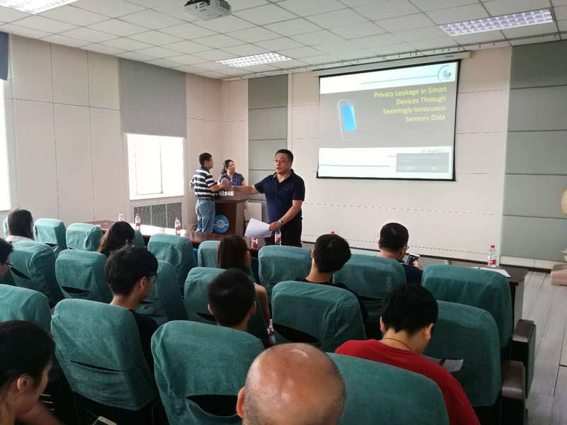 首先,科研副院长韩启龙教授向与会人员介绍李教授简历,针对学院与佐治亚州立大学在学生培养、科学研究等方面开展的合作进行了回顾和展望,并就交流内容向与会人员进行了提醒,要求双方交流要紧密围绕学术、科研开展。李教授结合其实验室目前的研究内容展开讲解,从数据隐私保护的重要性、研究背景、研究方案等方面详细的说明了当前移动设备安全保护方面的漏洞和急需解决的问题。报告环节之后,李教授同与会人员开展互动交流,与会教师同学踊跃提问,李教授均一一耐心回答,本次学术报告使太阳官网师生及时了解到国际最新研究动态,对开展科研工作起到积极的促进作用。