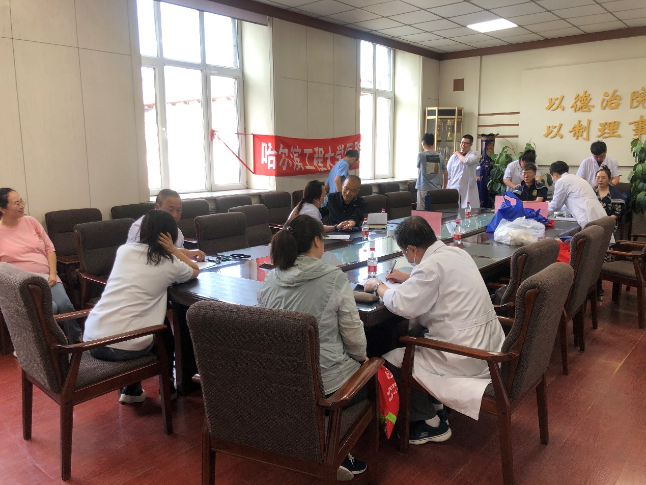 本次义诊校医院领导带队,派出中医科3位外聘专家、3位主力康复治疗师一行8人现场出诊,义诊项目包含:中医切脉(号脉)、中医推拿、DMS(深层肌肉放松)、筋膜枪、测量血压派送防疫药包、夏季驱蚊喷雾等。
