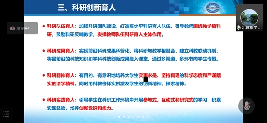 主讲内容以潜心育人,成为研究生科研路上的良师益友为重点,围绕着导师的作用、对好导师的理解、科研创新育人方法以及自身的认识体会四部分内容,阐述了科研创新潜心育人的重要性。结合自身实践经验进行了生动的讲解,内涵丰富,内容充实,广受教师好评。