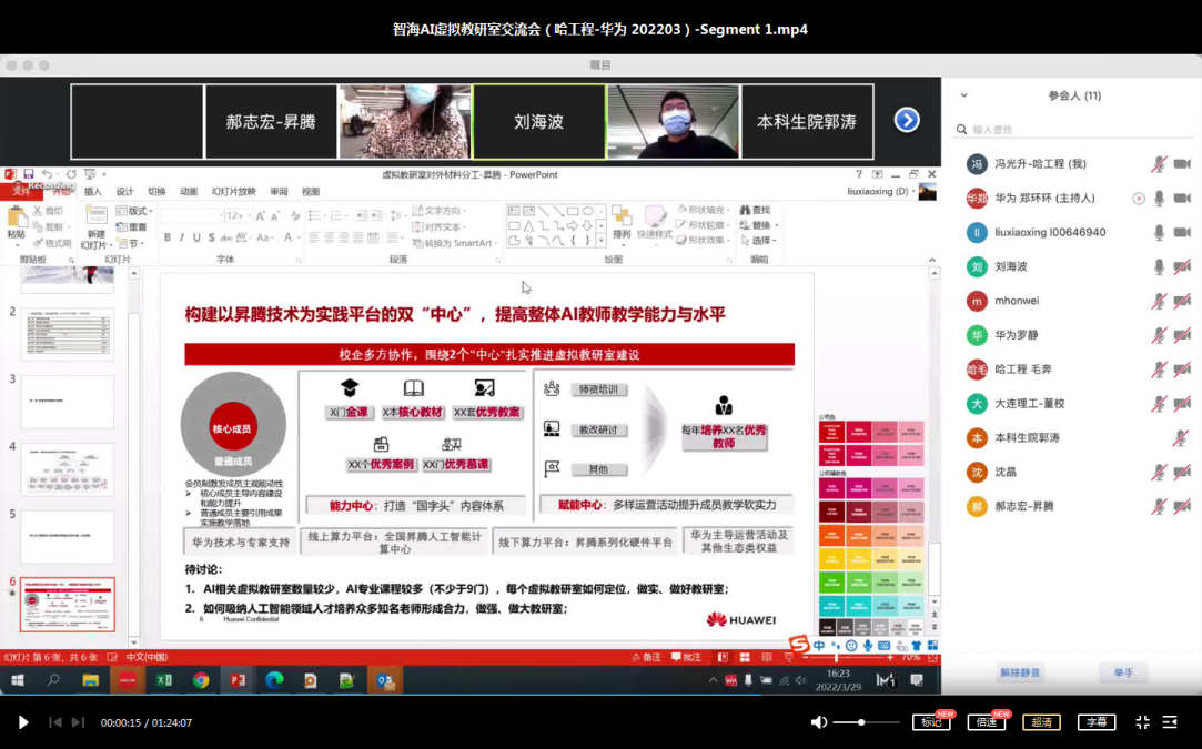 会上,刘海波教授首先介绍了校方对于智海AI虚拟教研室的建设方案以及智海AI课程的参与单位,包括太阳集团tyc539、大连理工大学、北部湾大学。随后华为工程师介绍了目前华为公司对于智海AI虚拟教研室建设的初步支持方案,会上双方就校方提出的建设方案和华为提出的支持方案进行初步的交流研讨,为下一步校企合作共同打造智海AI虚拟教研室奠定基础。