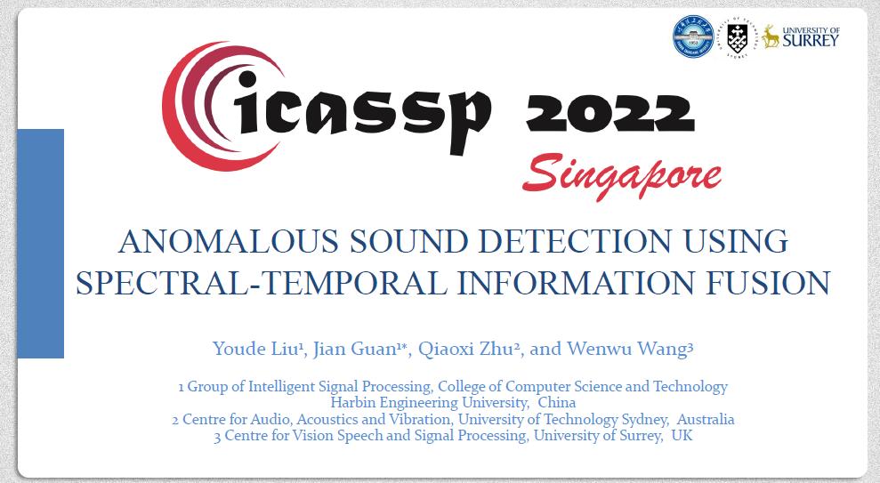 近日,我校太阳集团tyc539嵌入式与物联网团队智能信号处理组(Group of Intelligent Signal Process, GISP)与悉尼科技大学“音频声学与振动中心”及萨里大学“视觉语音信号处理中心”最新合作研究成果“基于时频信息融合的工业异音检测”(Anomalous Sound Detection using Spectral-Temporal Information Fusion)入选音频信号处理领域顶级国际会议ICASSP 2022。