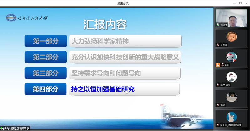 全体与会青年教师参加了学校科研院和学校青年科协联合开展的“弘扬科学家精神,做海洋强国追梦人”主题报告会。会上,张阿漫教授结合自身科研工作经验,对大力弘扬科学家精神,坚持需求导向和问题导向开展基础研究的工作实际讲授了专题报告,并和青年教师们进行了深入的交流。