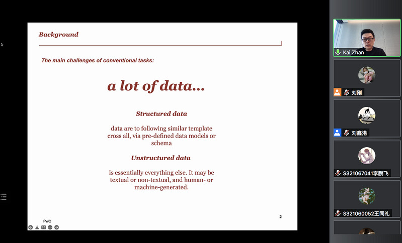 讲座人: Kai Zhan,普华永道澳大利亚首席数据科学家和高级经理,担任普华永道企业数字部首席数据科学家,负责人工智能跨越普华永道全球网络的跨线服务,涉及税务数字、保险、金融服务、风险咨询和医疗保健。他在新南威尔士大学获得机电一体化工程学士学位(一等荣誉),并于2015年获得悉尼大学项目管理硕士(优异奖)和机器学习博士学位。2015-2018年间,Kai Zhan曾在莫纳什大学信息技术学院担任研究员,2018年被任命为莫纳什大学高级研究员,研究领域涉及计算机视觉、文本挖掘、活动识别和用户建模等。