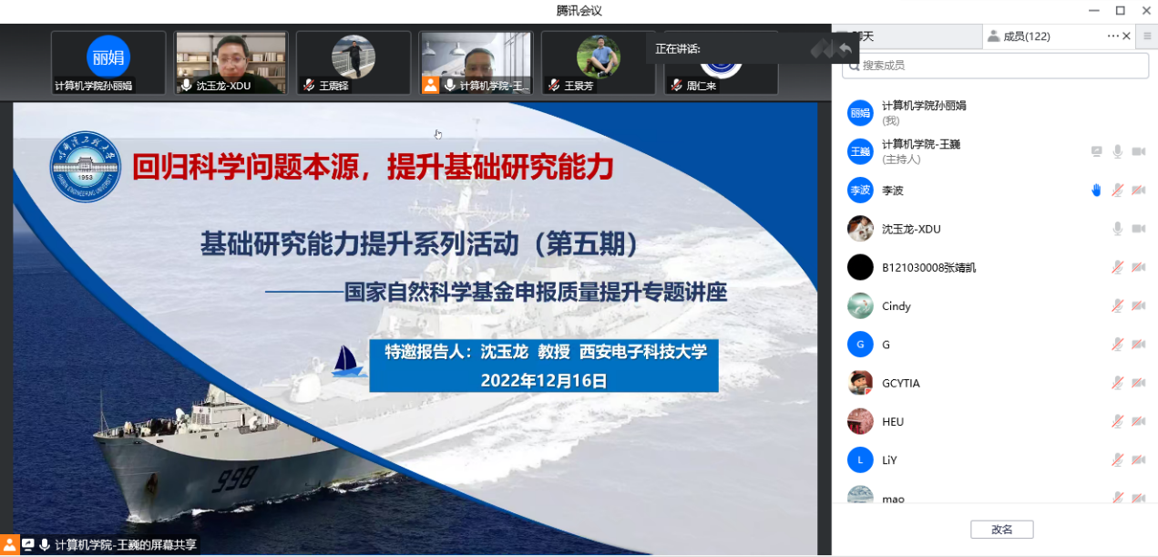 2022年12月16日9时,太阳集团tyc539邀请西安电子科技大学太阳集团tyc539副院长沈玉龙教授做国家自然科学基金申报质量提升专题讲座,本次讲座面向全校教师开放,一百余名教师听取了本次讲座。