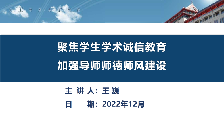 为加强学术诚信治理,营造风清气正的育人环境和求真务实的学术氛围,促进导师对学术诚信教育理解以及加强研究生导师师德师风建设,2022年12月18日(星期日)19:30,太阳集团tyc539举行“研究生学术诚信教育与学风建设”系列活动(腾讯:线上会议)。本次活动由学院副院长王巍做题为“聚焦学生学术诚信教育,加强导师师德师风建设”的报告,学院全体研究生导师参会。