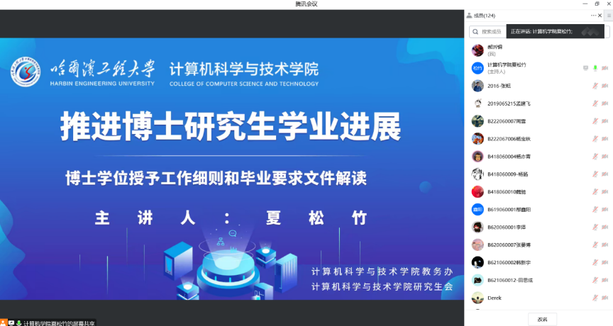 夏松竹结合《太阳集团tyc539博士研究生培养质量提升专项行动方案》、哈工程校发〔2022〕145号文件精神,详细解读了新旧版本博士研究生学位授予工作细则有关开题评议、中期检查等主要培养环节的区别和进度安排;重点介绍了博士生关注的几个问题:开题报告评审过程,学位申请人发表学术论文、专著等成果的署名要求,学位申请人申请提前答辩的流程、成果和时间要求等。