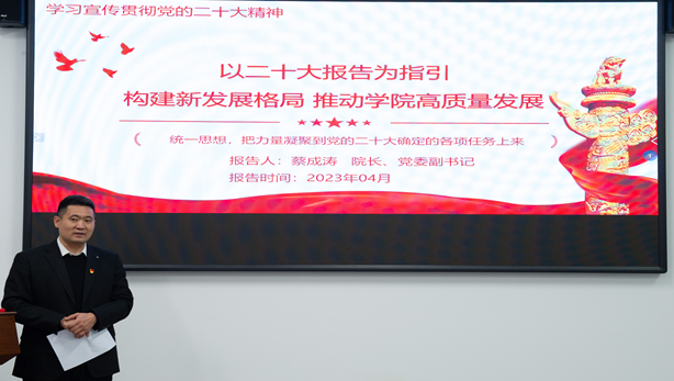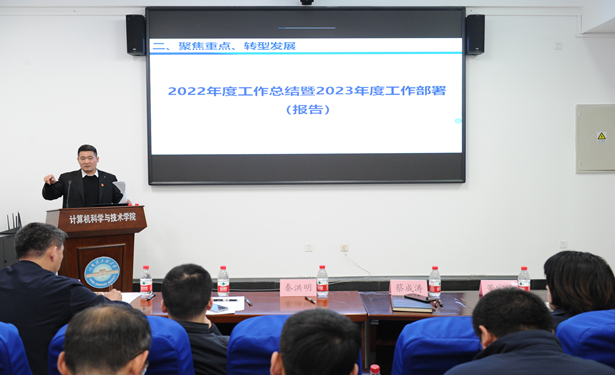 随后,蔡成涛代表学院作2022年度工作总结暨2023年度工作部署,报告围绕取长补短、明确目标,聚焦重点、转型发展两部分内容进行。他指出,要以五个“三年行动方案”为工作指南,以“聚焦问题抓根本、聚焦目标抓重点、聚焦能力抓基础、聚合资源抓改革”为指导思想,落实5项重点工作和14项基础性工作,转认识、转信念、转要求、转方式、转做法,打造一批战略科技人才、一流科技领军人才和创新团队、承担一批高层次教研课题、形成一批高水平科教成果、建成具有行业特色的一流科技创新高地和重要人才培养基地。