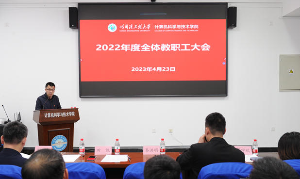 副院长田凯作学院2022年度工会工作报告以及2022年度学院财务工作报告。工会工作报告围绕学校和学院中心工作,深入开展"三全育人"活动;关心教工切身利益,为教工排忧解难、多为教工办实事、办好事;大力加强精神文明建设,组织教工积极参加校工会各类活动、积极维护女教工合法权益以及2022年学院工会会费收支等5大方面进行汇报。财务报告依据学院日常办公经费、发展经费、发展建设经费、自筹经费、计算机等级考试报名费、教职工培训经费以及大型仪器设备开放共享院系管理费的使用、收入、支出、余额等内容进行逐项报告。
