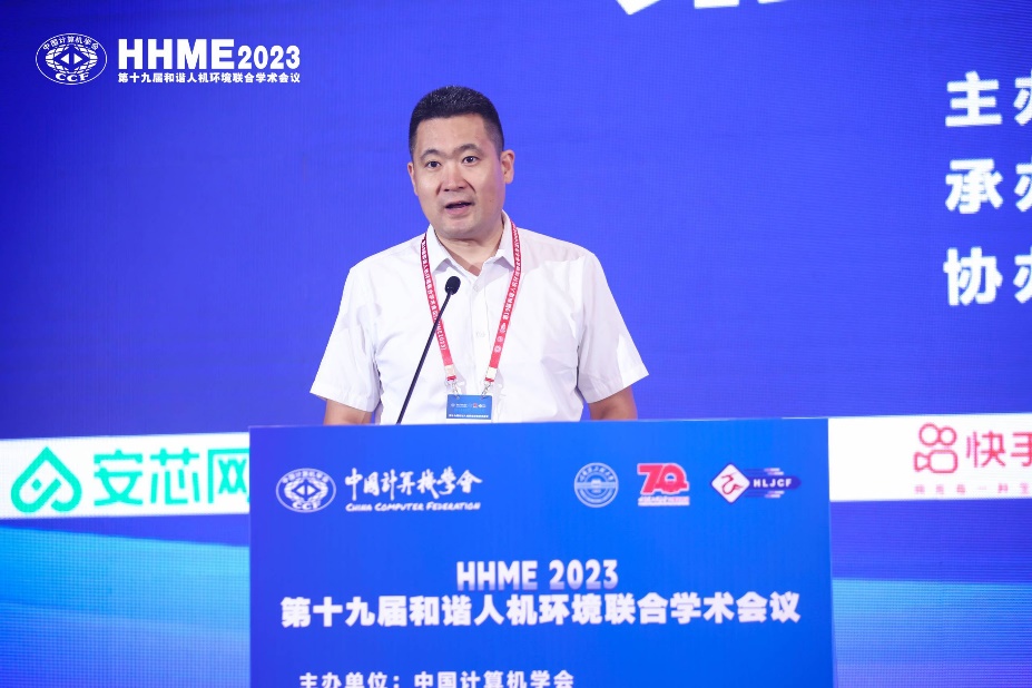 金海代表中国计算机学会致辞。他首先代表CCF理事长和秘书长预祝大会圆满成功,并在致辞中回顾了HHME的发展过程,称其为多个专委会共同举办学术会议开了一个很好的先例;称赞了普适计算专委会和人机交互专委会对学术交流与学术沉淀的重视;对当前CCF各专委会2023年线下举办会议的总体形势进行了分析和总结。