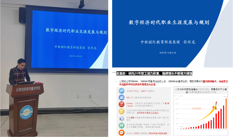 中软国际教育科技集团哈尔滨基地总监张怀龙以“数字经济时代职业生涯发展与规划”为主题对集团进行了总体介绍,包括业务范围、解决方案、服务模式和发展规划。然后,对当前数字化时代的发展趋势进行了介绍,包括数字经济的概念、数字化人才的概念和数字人才的培养。最后对当代大学生在当前数字经济时代下的素质能力要求以及职业发展规划进行了分析与建议。
