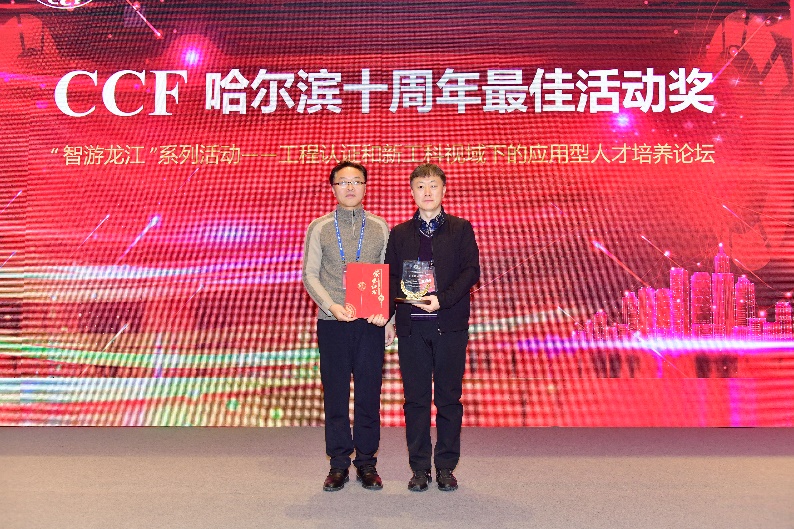 在庆典活动的颁奖环节,学院潘海为教授牵头举办的”智游龙江”系列活动一一工程认证和新工科视域下的应用型人才培养论坛被授予“CCF哈尔滨十周年最佳活动奖”。