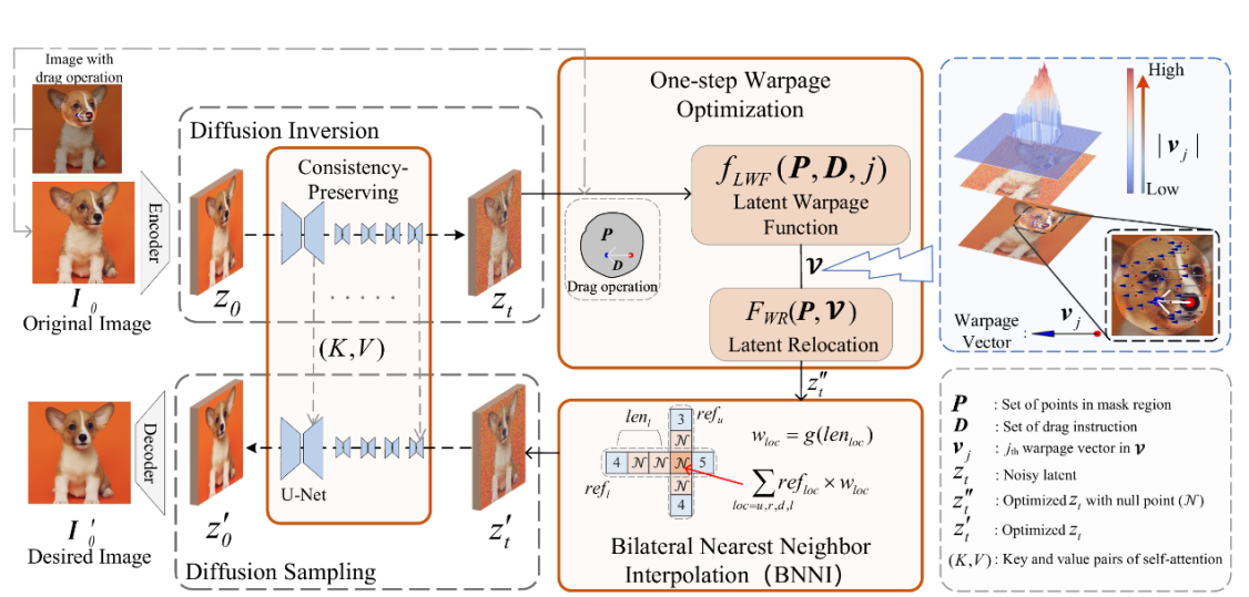 合作团队对基于拖拽的生成式图像编辑技术进行研究,旨在保持图像特性的前提下,实现对图像内容的快速精确控制。传统的基于拖拽的图像编辑方法通常采用多步迭代完成潜在语义的优化,需要大量时间,限制其实际可用性。FastDrag给出了一种全新的潜在语义优化策略,通过模拟拉伸材料的行为,创新性地提出了潜在翘曲函数(Latent Warpage Function, LWF),可以一次性调整潜在空间内各个像素的位置,实现对潜在空间的一步语义优化,从而大幅提升图像编辑速度。实验结果表明,FastDrag在处理效率和编辑效果上均显著优于现有方法。这一研究不仅为生成式图像编辑提供了全新的解决方案,也为用户提供了更加高效、直观的操作体验。