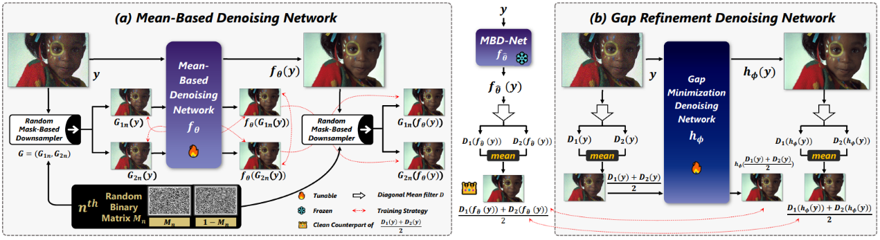 第一篇论文“Zero-Shot Noise2Mean: Gap Minimization for Efficient Denoising from a Single Noisy Image”,作者刘铎、史一岐、张国印、李思照和张立国。论文通过减少及消除噪声图像与清晰图像之间的差距来实现高质量的图像去噪,所提出的“Zero-Shot Noise2Mean”不需要训练数据或噪声分布的先验知识。作者设计了两个轻量级网络,可以仅使用单个噪声测试图像进行训练。实验表明,该方法在去噪性能和效率方面均表现出色,达到了更好的去噪效果。