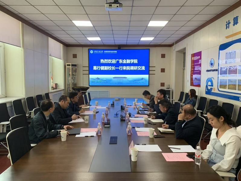 5月12日,广东金融学院副校长易行健,大数据与人工智能学院执行院长廖文辉、副院长万德焕,太阳集团tyc539副院长伍春晖一行来学院进行调研交流。太阳集团tyc539副院长田凯、副院长王巍、副院长苘大鹏、院长助理李伟、学生工作办公室李宇婷、科研学术办公室齐海洋及部分优秀博士毕业生参加会议。