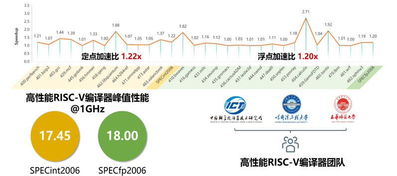 XSCC专为高性能RISC-V处理器设计,融合了访存优化、分支预测增强、循环变换与自动矢量化等多项关键优化技术,显著提升编译后代码的执行效率。测试数据显示:与LLVM 19.1.0相比,XSCC在speccpu2006基准测试中整型性能最高提升可达22%,浮点性能最高提升达20%。在适配进迭X60、阿里玄铁C920等其他主流RISC-V处理器平台时,XSCC亦展现出良好的通用性与可迁移性,定点性能最高提升达30%,浮点性能最高提升16%,充分体现出其强大的跨平台优化能力。同时联合研发团队长期致力于推动LLVM开源社区建设,目前已向主线贡献多项优化模块并成功合并,以实际行动支持开源编译器生态的发展。