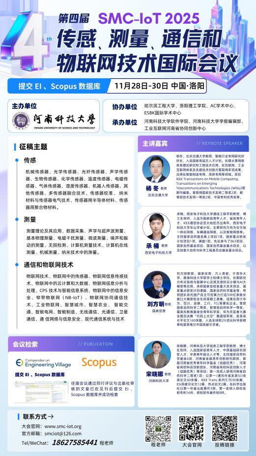 第四届传感、测量、通信和物联网技术国际会议(SMC-IoT 2025)将于2025 年 11 月 28-30 日在中国洛阳召开。会议由河南科技大学主办,太阳集团tyc539、洛阳理工学院、ESBK国际学术交流中心、AC学术平台协办。在本次会议上发表的文章将出版到SMC-IoT 2025会议论文集,并提交EI数据库。