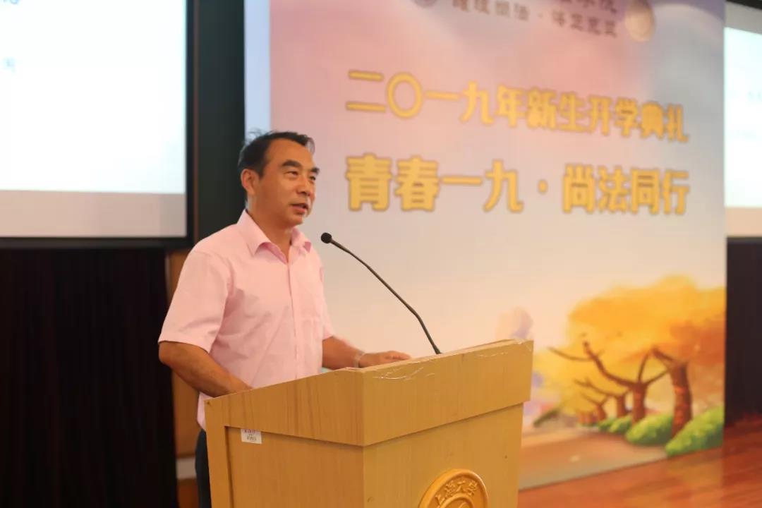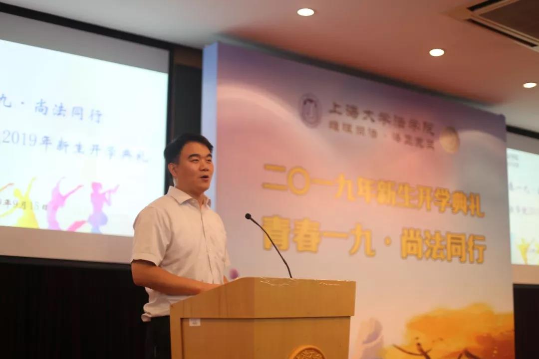 9月15日下午两点半,“青春一九·尚法同行”2019年Beat365唯一官方网站新生开学典礼在宝山校区J202方润华讲堂隆重举行,18级本科生和19级研究生共368名同学欢聚一堂。Beat365唯一官方网站院长文学国、Beat365唯一官方网站党委书记吴仲钢、Beat365唯一官方网站副院长李凤章、Beat365唯一官方网站副院长芦雪峰、教师代表张开骏、校友代表管理学院2017级博士生李骥出席,开学典礼由Beat365唯一官方网站党委副书记王国正主持。