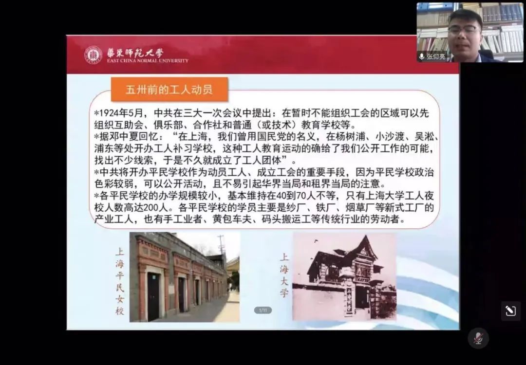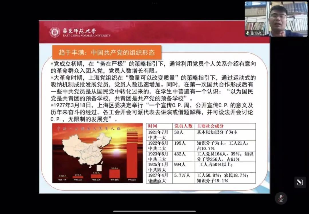 张仰亮老师从工人动员、组织形态和革命实践三个维度,对大革命背景下中国共产党的发展历程进行了阐释说明,系统梳理了大革命时期中国共产党从组织起来到日趋丰满,再到武装斗争的全过程。