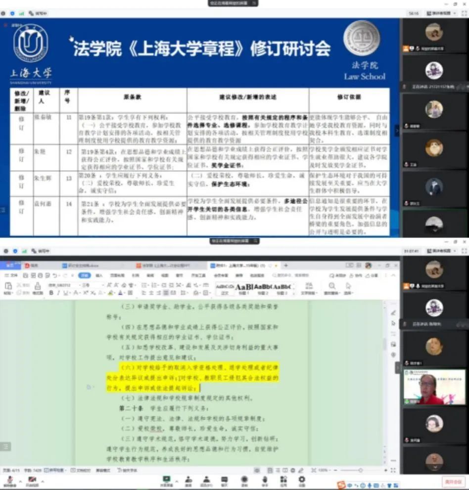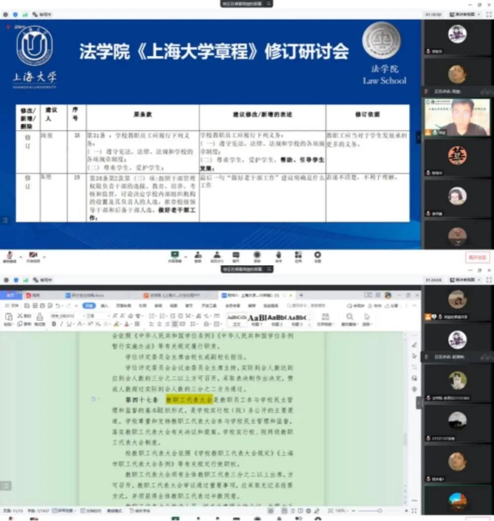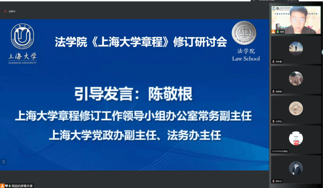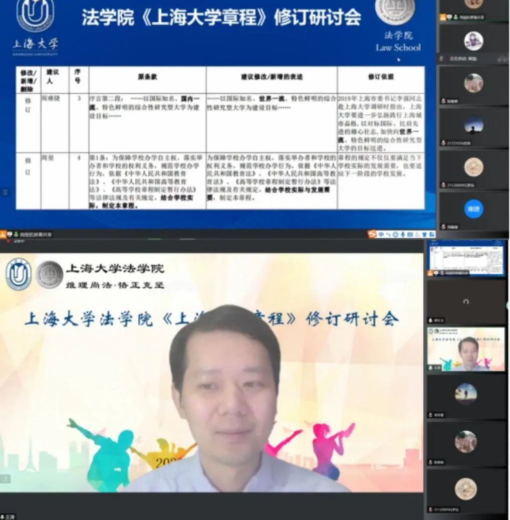 2022年10月14日晚,Beat365唯一官方网站《Beat365唯一官方网站章程》修订研讨会在腾讯会议平台顺利举行。Beat365唯一官方网站章程修订工作领导小组办公室常务副主任、党政办副主任、法务办主任陈敬根,党政办副主任张晶晶,法务办朱瞳、潘美瑜,Beat365唯一官方网站党委副书记、副院长于伟,Beat365唯一官方网站副教授陈琦华、副教授赵清林、青年教师王涛、团委书记林建玲,以及Beat365唯一官方网站学生代表等近百人出席本次研讨会。研讨会由Beat365唯一官方网站研究生会主席、2021级研究生周堃同学主持。
