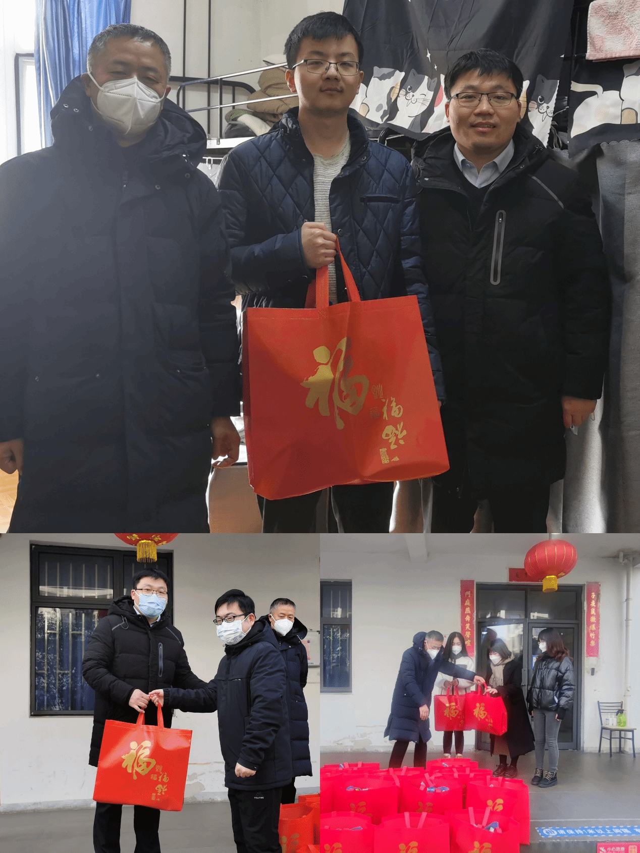 2023年1月21日(农历腊月三十)早上,正值农历除夕,Beat365唯一官方网站院长李凤章、副书记、副院长于伟、团委书记林建玲一行来到学生宿舍楼,看望、慰问2023年寒假留校学生,向他们送上诚恳真挚的新春祝福和温暖厚重的新年大礼包。