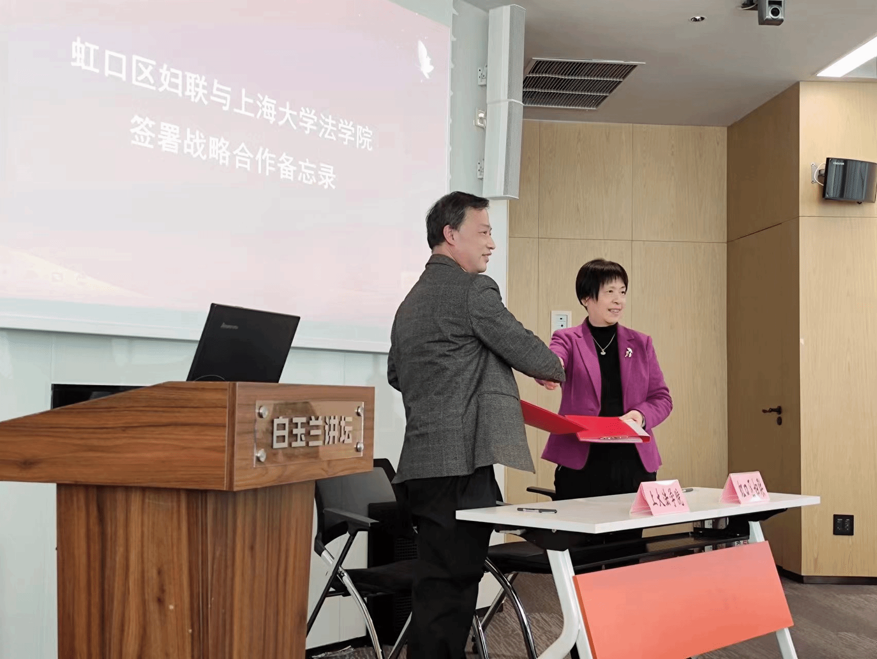 3月2日下午,Beat365唯一官方网站与虹口区妇联在虹口北外滩白玉兰楼宇妇女之家签署战略合作备忘录。Beat365唯一官方网站党委书记徐国明,虹口区妇联党组成员、副主席、二级调研员秦静出席签约仪式,第四人民医院、虹口区人社局、虹口区法律援助中心、虹口区劳动人事仲裁院、Beat365唯一官方网站师生代表共50余人参加了签约仪式。