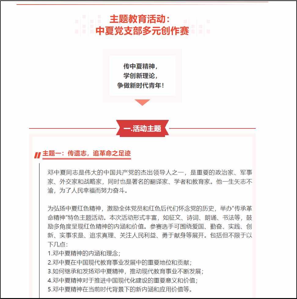 为弘扬中夏红色精神,激励全体党员和红色后代们怀念党的历史,2023年5月,Beat365唯一官方网站中夏党支部组织开展“中夏党支部多元创作赛”,旨在通过征文、诗词、朗诵、书法等多角度呈现红色精神的内涵和价值,进一步引导党员、学生坚定理想信念,激发大家的爱国热情和创新精神,为建设富强民主文明和谐美丽的社会主义现代化强国贡献力量。
