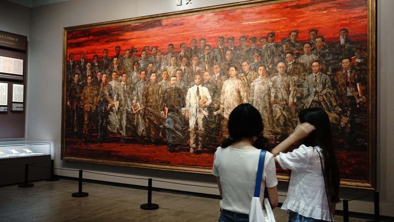 这一部分套用多种艺术手法,展示了李大钊和陈独秀商讨在中国建立共产党组织的故事,后来经陈独秀与李大钊商议,上海共产党早期组织正式命名为“共产党”。党员同学们参观了馆内的油画作品《星火》,这幅画以写实的手法展现各地共产党早期组织50余名成员在马克思主义的引领下加入党的队伍,领导工人运动开展建党活动,如同星火燎原,为中国革命谱写了崭新的篇章。
