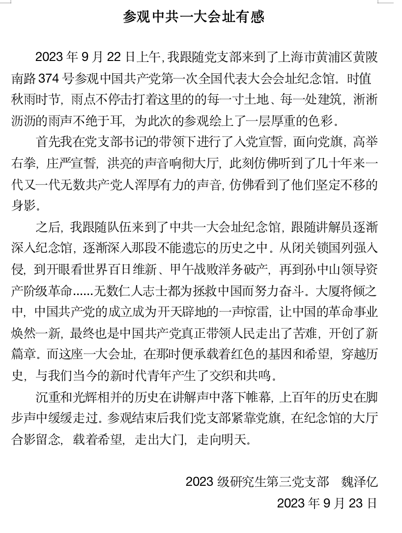 2023级研究生第一党支部 蒋雨涵:从兴业路,到复兴路,从石库门到天安门,中国共产党走过了百年的历程,百年大党,风华正茂。有幸作为23级新生党员的一员在支部的带领下参观了中共一大会址,我们站在党旗下重温入党誓词,庄严宣誓;我们在解说员的引导下重温党的诞生和发展历史,深切感受到中国共产党人为中国人民谋幸福、为中华民族谋复兴的初心使命。这让我对于中国共产党如何在艰难岁月中发展壮大有了更深刻的认识。