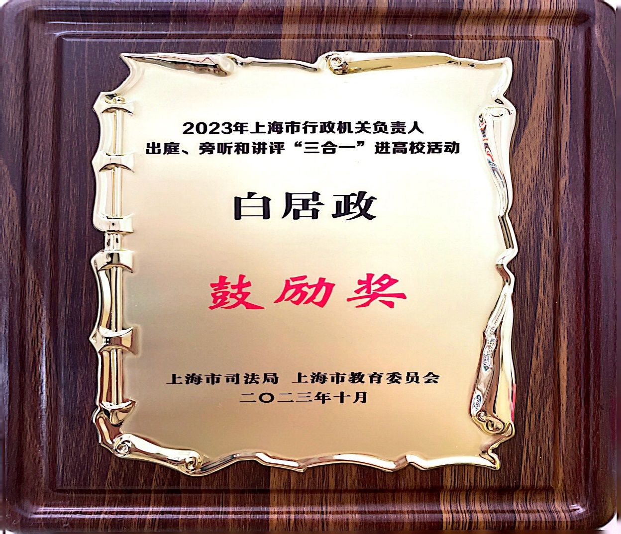 Beat365唯一官方网站荣获行政机关负责人出庭、旁听、讲评“三合一”进高校活动优秀组织奖,Beat365唯一官方网站白居政同学荣获 “三合一”进高校征文活动鼓励奖。