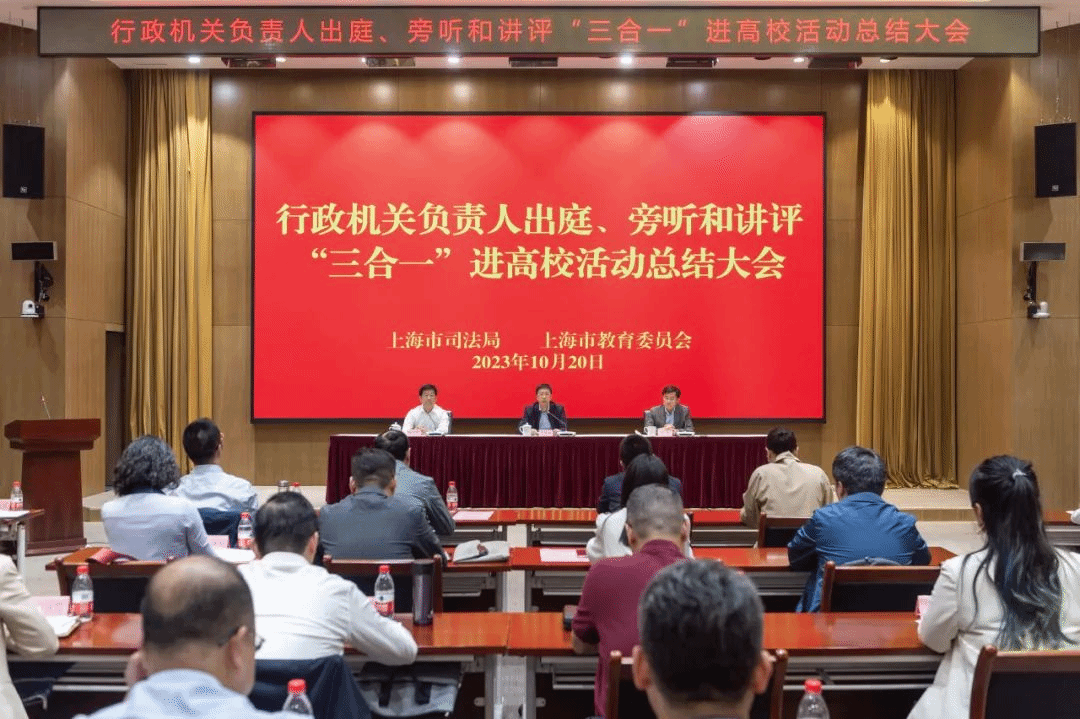 10月20日,市司法局与市教委联合召开的行政机关负责人出庭、旁听、讲评“三合一”进高校活动总结大会在上海市司法局举行,市司法局党委书记、局长吴坚勇,市教委副主任王浩参加会议并讲话。市司法局党委委员、副局长刘言浩主持会议。上海市各区司法局和Beat365唯一官方网站、复旦大学等高校代表参加会议。