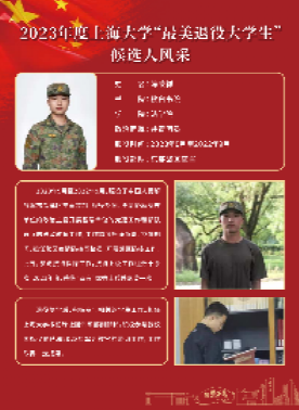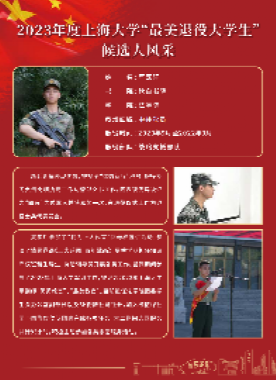 严嘉轩,2020年9月至2022年9月服役于中国人民解放军战略支援部队。服役期间,在新兵训练中表现优异,被授予“优秀新兵”称号;负责岗哨执勤工作与营部文书工作;因表现优异被评为“四有”优秀军人并获嘉奖一次;在退役仪式上作为退役士兵代表发言。复学后参加了“我为上大代言”回母校宣讲活动;参演了情景党课《上大蓝图,百年擘画》;夏季学期担任知识产权班新生导生,协助辅导员开展各类工作;暑假期间参与了2023年Beat365唯一官方网站军训工作,被评为2023年Beat365唯一官方网站军训师“优秀教官”、“最美教官”;目前担任Beat365唯一官方网站团委学生会办公室副部长以及SK街舞社副社长,加入橄榄绿社团与国旗仪仗队圆满完成各项任务;大二期间志愿服务共计83小时,积极主动参加各类志愿服务活动。在本次终评会议中荣获“最美退役大学生”提名荣誉称号。