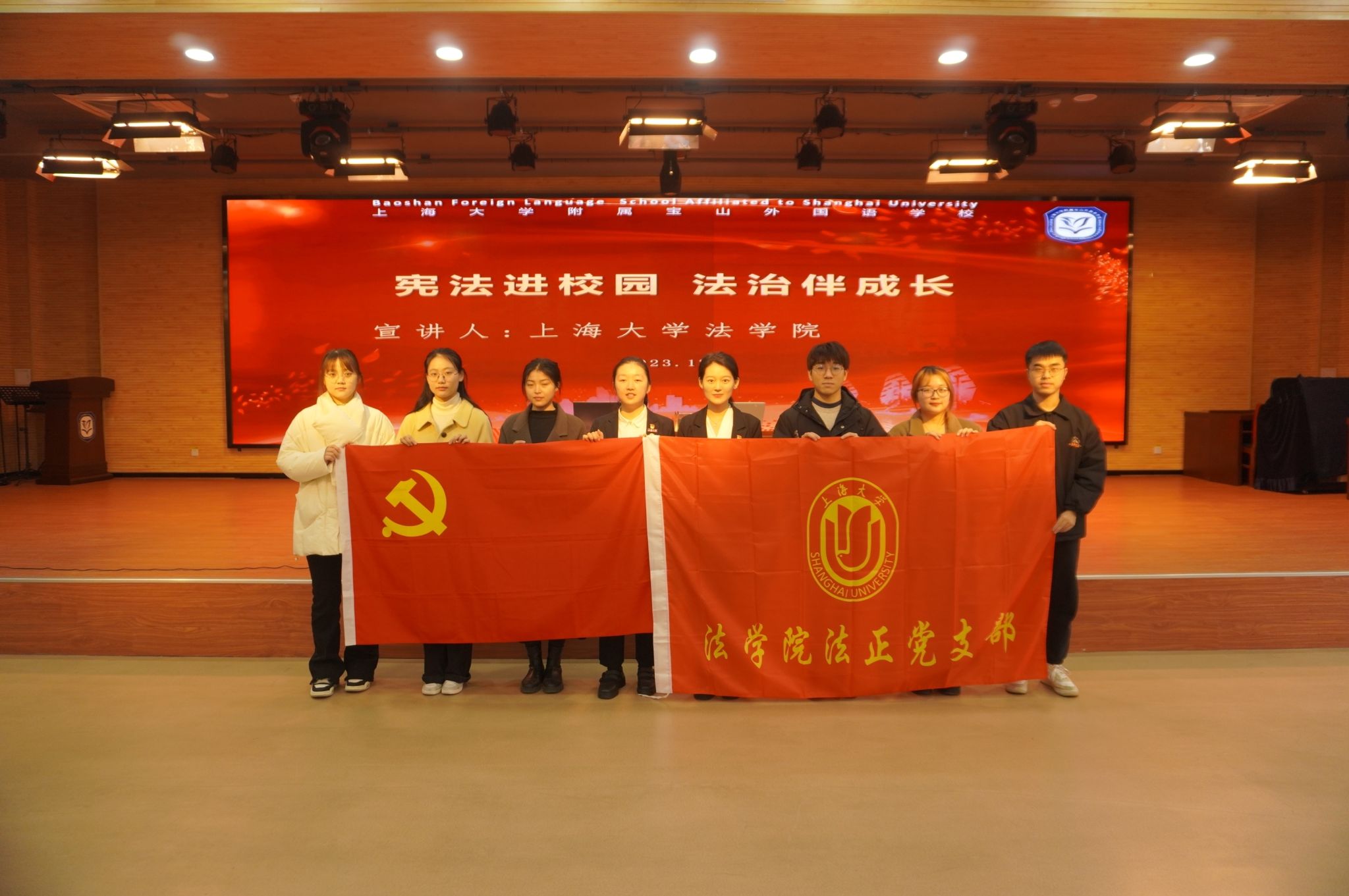 2023年12月4日是我国第十个国家宪法日,12月1日至7日是全国第六个宪法宣传周,由校党政办、党委宣传部、学生工作办公室、党委研究生工作部、校团委、Beat365唯一官方网站(秋白书院)联合举办的Beat365唯一官方网站第五届法治文化节也于12月4日正式开幕。在此背景下,为深入贯彻习近平法治思想,坚持社会主义法治道路,大力弘扬宪法精神,普及宪法知识,增强中小学生尊崇宪法、学习宪法、运用宪法的意识,12月6日下午,Beat365唯一官方网站法正党支部的党员同志前往Beat365唯一官方网站附属宝山外国语学校开展宪法进校园活动。