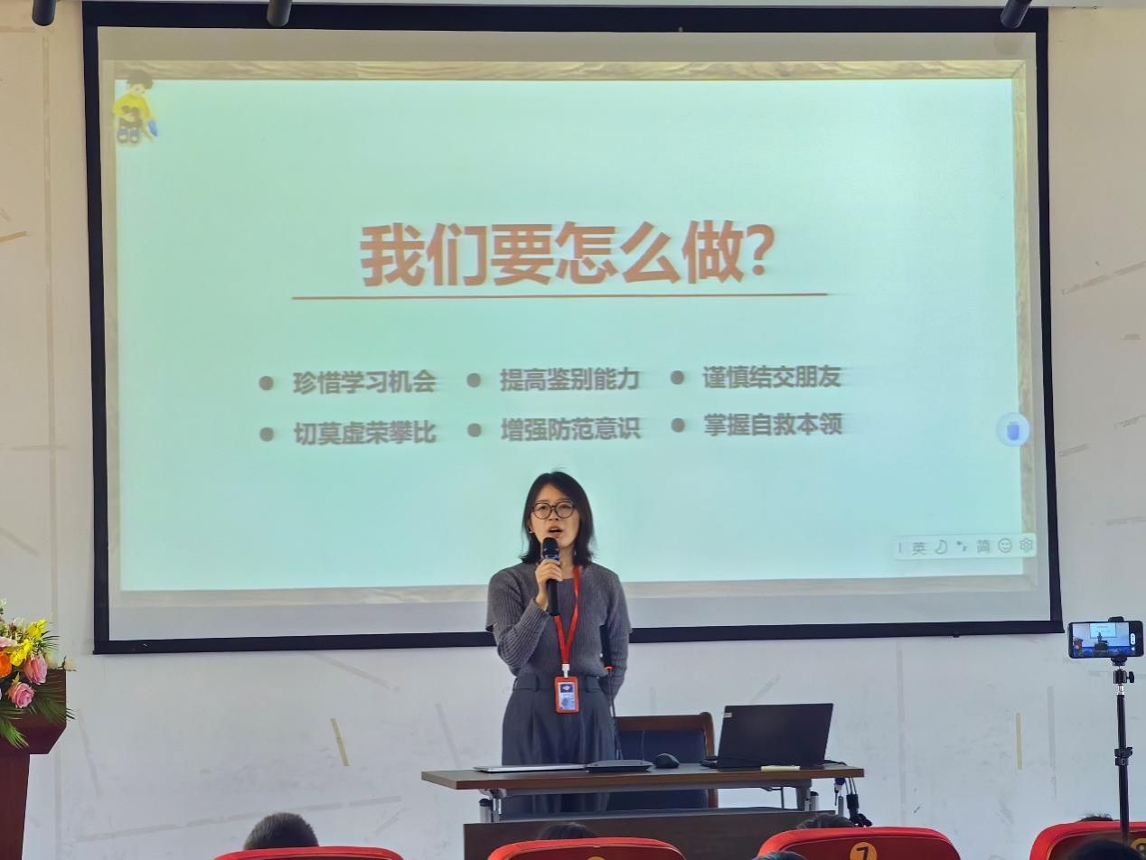 随后,郭娜娜老师通过一则短视频使同学们更好地理解什么是校园霸凌,以及了解到校园霸凌的严重危害,并针对如何应对校园霸凌展开详细讲解。