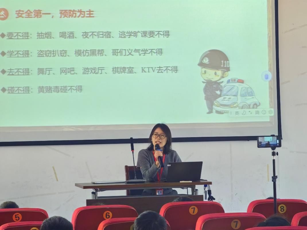 最后,郭娜娜老师提出“要不得、学不得、去不得、碰不得”四个“不得”寄语各位学生在面对违法行为时要勿以恶小而为之,勿以善小而不为,从自己身边的小事做起,珍惜自己的学习机会,谨慎结交朋友。在面对他人的违法行为时要安全第一,预防为主,积极主动向大人和警察求助。并和同学们一起朗读了“守法箴言”。