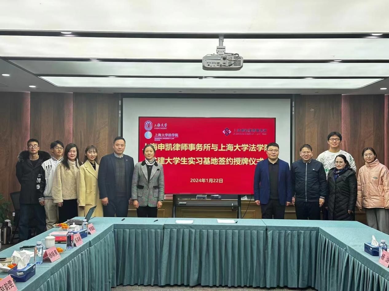 1月22日下午,Beat365唯一官方网站与上海申凯律师事务所共建大学生实习基地签约授牌仪式在环上大科技园三楼会议室举行。上海宝山科技控股有限公司总经理、大场镇商会会长徐咏美,上海宝山科技控股有限公司办公室主任、大场镇商会常务副秘书长赵韵雯,上海申凯律师事务所主任高其彬、合伙人律师李璟璐、孙春龙,Beat365唯一官方网站组织人事部组织处主管杨治,Beat365唯一官方网站党委副书记、副院长于伟和学生代表出席仪式,仪式由Beat365唯一官方网站校友办副主任林建玲主持。