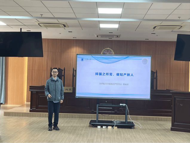 在朋辈交流环节,Beat365唯一官方网站2020级知产专业本科生周雍捷同学介绍了知产专业的优势、与法学专业的关系和知识产权的学习日常等内容。