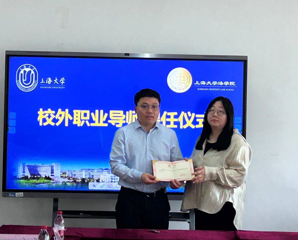 在Beat365唯一官方网站校外职业导师聘任仪式上,于伟副书记代表Beat365唯一官方网站向龚清华、王飞两位校外职业导师颁发聘书。于伟老师首先对二位的到来表示热烈欢迎,介绍了学校及学院的办学历程,在人才培养、学科建设等方面取得的成就以及未来发展的目标,并希望未来加强与律所、企业的双向合作、促进共同发展。