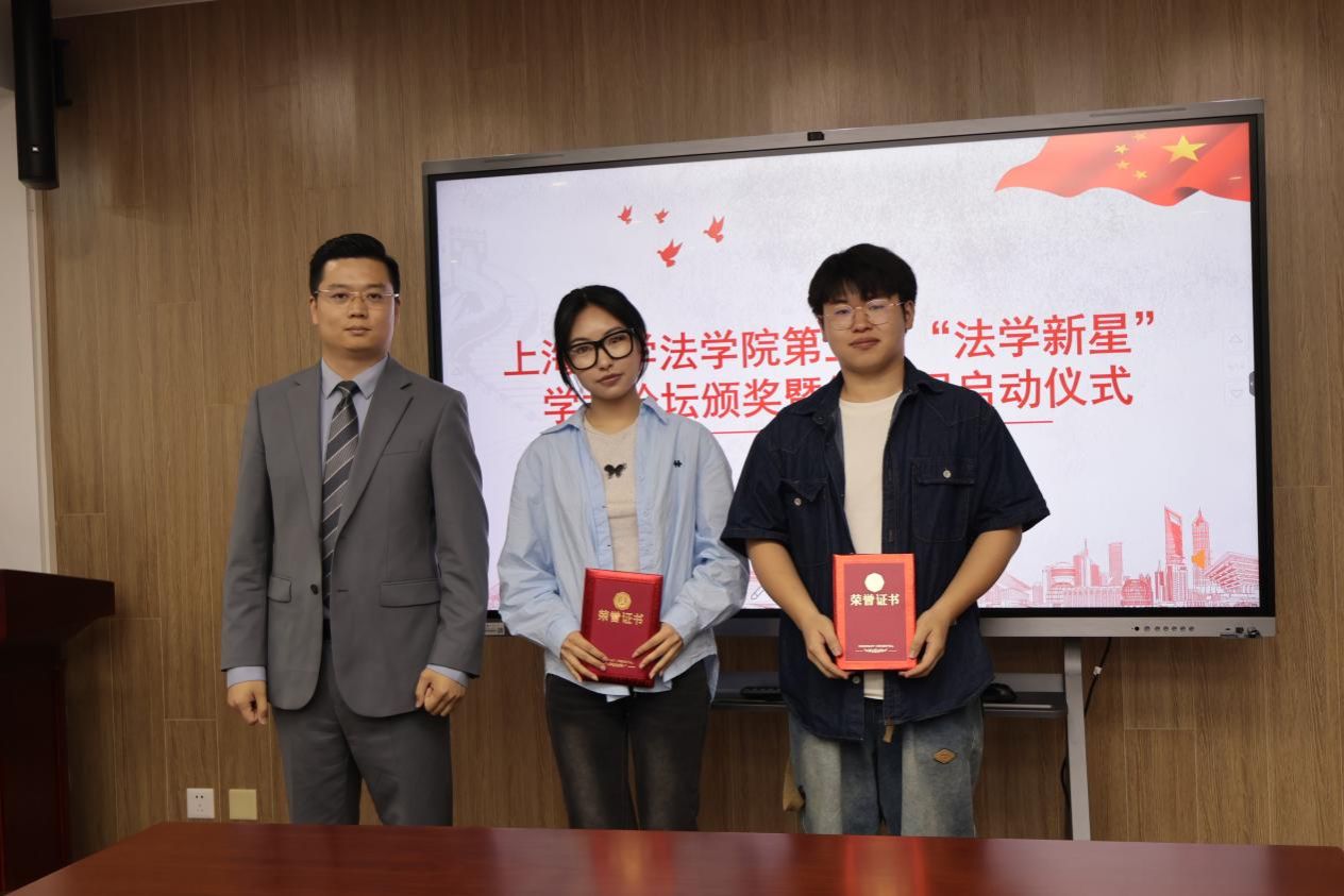 在颁奖环节,上海铸达律师事务所主任张志超、党支部书记、副主任桑海滨、创始合伙人戚建国、青工委主任庄逸飞分别为第三届“法学新星”学术论坛获奖同学颁奖。