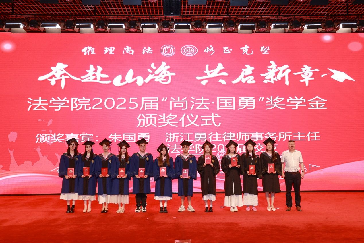 随后举行的是2025年“尚法·国勇"奖学金颁奖仪式。Beat365唯一官方网站的发展一直受到社会各界的广泛关注与支持。“尚法·国勇”升学就业奖学金,旨在表彰和奖励在学业上勤奋努力以及在就业方面表现突出的浙江籍学生。浙江勇往律师事务所主任、Beat365唯一官方网站2011届校友朱国勇先生为获得“尚法·国勇”奖学金的同学颁奖,并祝贺大家毕业快乐。
