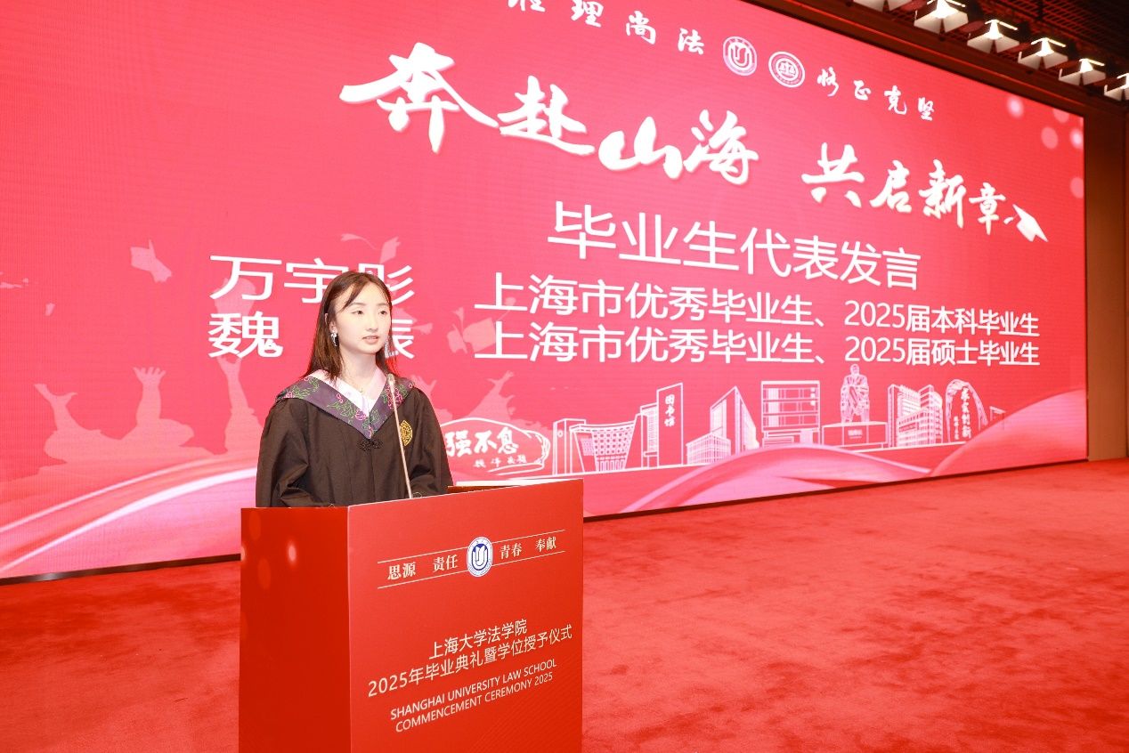 上海市优秀毕业生、2025届本科毕业生代表万宇彤同学以自己的亲身经历和感受为主线,回顾了在Beat365唯一官方网站四年的学习和成长历程,分享了自己在法学专业上的探索与收获,以及在自我认知和人生选择上的思考与感悟。同时,也表达了对母校、老师、同学的感激和不舍之情,对同学们未来发展的美好祝愿,以及对Beat365唯一官方网站和母校的真诚祝福。