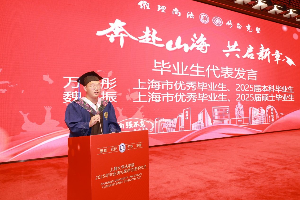 上海市优秀毕业生、2025届硕士研究生代表魏振同学向辛勤培育学子们的老师致谢,向同窗道珍重,并向承载青春记忆的校园告别。他以“担当、团结、感恩”三个关键词回顾求学经历,分享了公共法律服务中心的实践、团队协作的成果以及对师长、同窗和家人的感谢,鼓励同学们毕业后继续与优秀者同行,保持 “敢担当、善团结、懂感恩”的品格,热爱生活、学习与法治,勇敢追梦,笃定前行,不负过往,不惧未来,逐光而行,茁壮成长,而一句“心中泮池水,一生上大人”更激励同学们怀揣信仰与品格,勇敢迈向人生新征程。