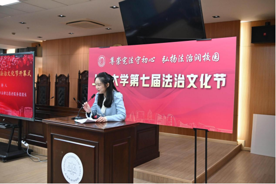 情景剧落幕之后,党政办公室副主任、法律事务办公室主任陈敬根代表主办单位,详细介绍了第七届法治文化节的整体活动安排。本届文化节紧扣“尊崇宪法守初心,弘扬法治润校园”主题,立足师生法治需求与社会普法热点,精心设计了多元化活动。既有宪法日集中普法、求职就业法律宣讲、“法言杯”辩论赛等经典品牌活动,也涵盖模拟法庭观摩、反诈骗系列宣讲、国家安全专题讲座、公共法律服务中心咨询体验日等特色内容。通过理论学习与实践体验相结合、校园宣传与社会辐射相促进的方式,持续深化法治文化浸润,着力营造“人人学法、时时讲法、处处用法”的校园生态,为学校“双一流”建设筑牢法治根基。