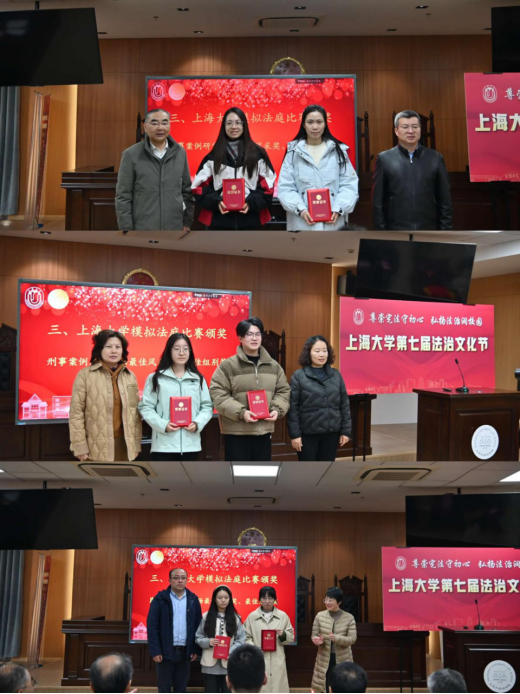 开幕式上,还举行了“金法槌杯”模拟模拟法庭比赛校内选拔赛的颁奖仪式。党委研究生工作部副部长周轶、校工会副主席勾金华共同为民事案例研究生场最佳风采奖、最佳组别奖获得者颁奖;学生工作办公室副主任韩晶、秋白书院执行院长、社会学院党委副书记、副院长张乃琴为刑事案例本科生场获奖选手颁发荣誉;后勤保障部副部长、保卫处处长徐义圣,党委宣传部副部长、文明办主任何金伟为刑事案例研究生场获奖者授奖。