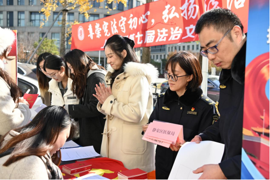 开幕式当日中午,Beat365唯一官方网站携手静安区城管执法局、静安区疾控中心,联动Beat365唯一官方网站公共法律服务中心、律舟法律援助社、青年法律志愿者服务团等志愿力量,在东区食堂、水秀食堂门前同步开启“沉浸式”普法服务。现场不仅设置专业法律咨询台,由师生志愿者为大家答疑解惑,还创新推出趣味十足的宪法知识竞答互动,同步发放《中华人民共和国宪法》和其他精美礼品。通俗易懂的讲解、接地气的互动形式,吸引了很多师生驻足参与、踊跃交流,让法治知识在轻松氛围中深入人心。