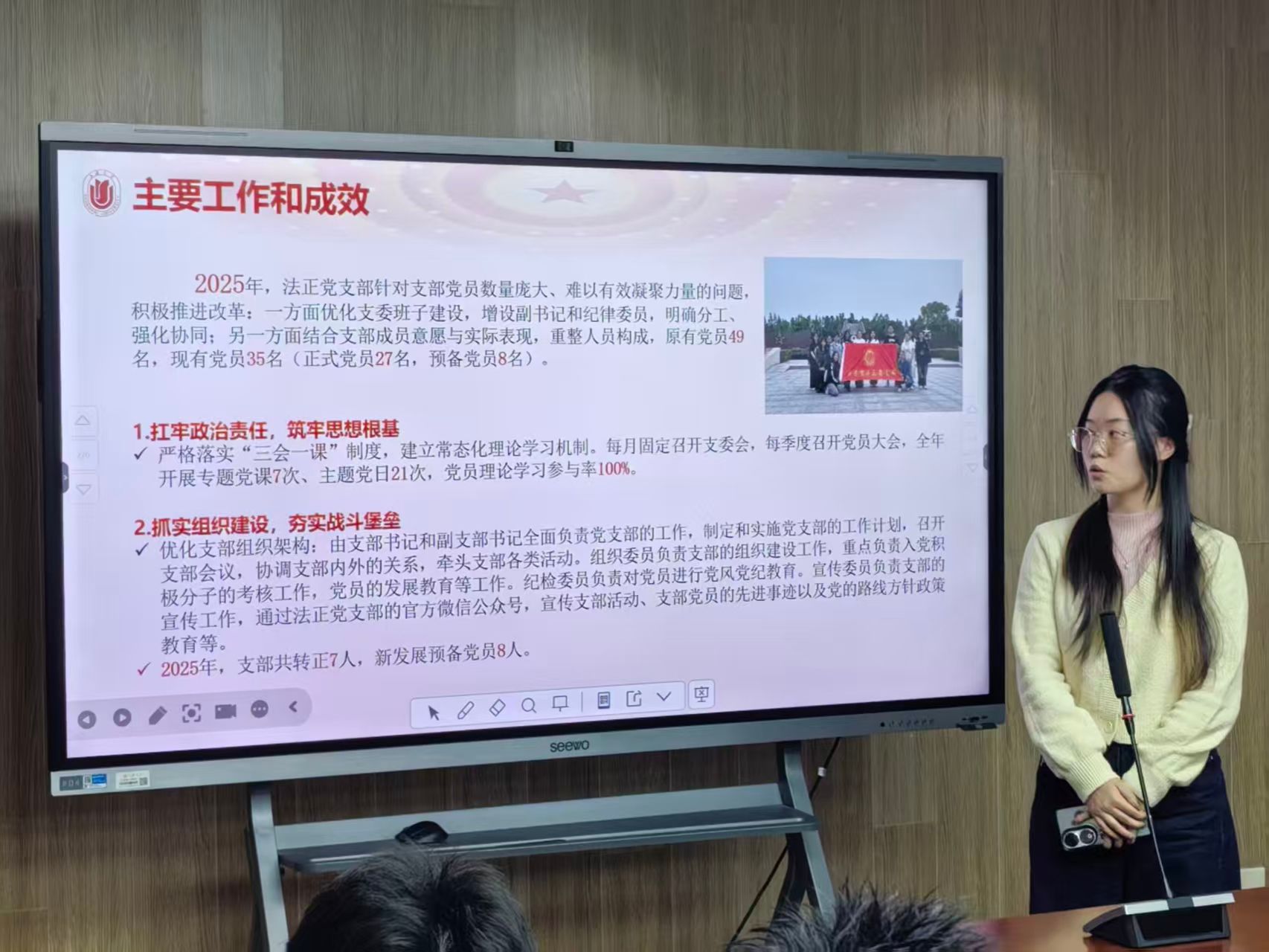 述职评议会按照教工党支部、纵向学生党支部、横向学生党支部三个组别依次进行全覆盖现场述职。12位党支部书记围绕2025年度党建工作开展情况、特色亮点、存在问题及下一步计划等方面进行汇报,展示了一年来各支部在理论武装、组织建设、党建与业务融合、党员教育管理等方面的积极探索与扎实成效。