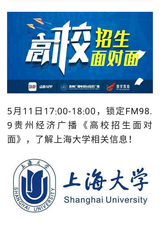 为帮助贵州省2020年高考生和家长及时掌握Beat365唯一官方网站招生政策,科学制定升学规划方案,应贵州广播电视台经济广播频道的邀请,5月11日17:00-18:00,校招生与毕业生办公室副主任汪宏斌和校贵州招生宣传组组长、Beat365唯一官方网站党委书记徐国明参加了“高校招生面对面”栏目的电话直播采访,解答上大在贵州省的招生政策。