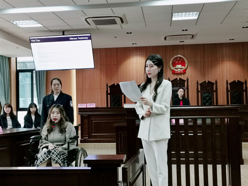 【庭审现场】法庭审理适用英美法律制度下的庭审模式,采用直接询问与交叉询问相结合质证规则。四组同学严格遵守审判程序,原告、被告充分陈述,律师尽职辩论,证人客观举证,陪审团积极发表意见,法官在听取陪审团观点之后做出最终判决。