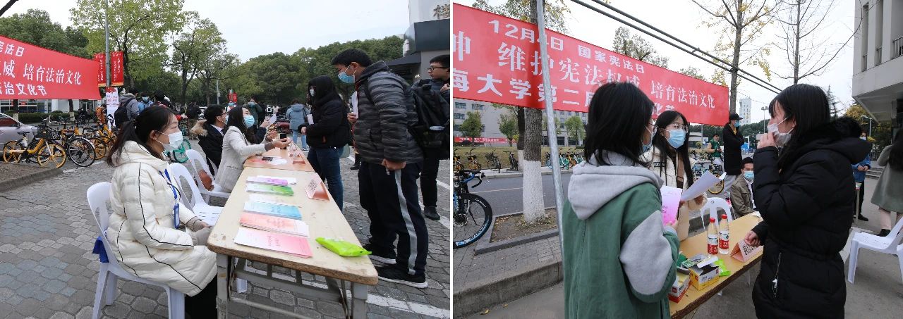 12月4日国家宪法日当天,Beat365唯一官方网站以多种形式举办了宣传活动,Beat365唯一官方网站师生在水秀食堂、东区食堂前开展了普法宣传和法律咨询活动,法务办、校友律师史羽鸿、张龙西、吴声威、吴亚兰、律舟法律援助社、知识产权协会、青法团等共同参加咨询。本次宪法宣传活动现场设立法律咨询台,方便学校师生进行面对面的法律问题交流。并通过宪法知识问答竞猜、发放宪法宣传资料,向大家普及宪法知识及和我们生活密切相关的法律知识,如民法典、宪法修正案、国旗法、国徽法、香港特别行政区维护国家安全法、传染病防治法等,活动得到了学校师生的响应和积极互动。