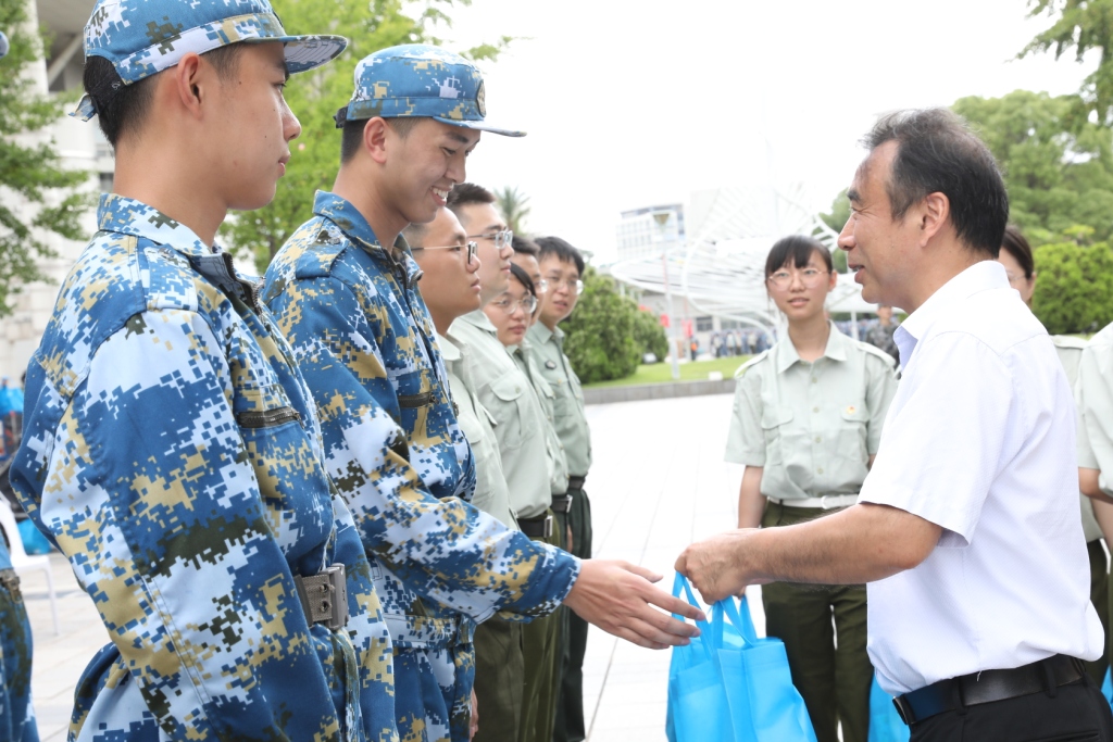 7月22日上午,学院院长文学国、党委书记徐国明在训练场地观看军训师二团的会操,看望学院2019、2020级军训学生,慰问承训教官和带队教师。学院党委副书记王国正主持慰问活动。